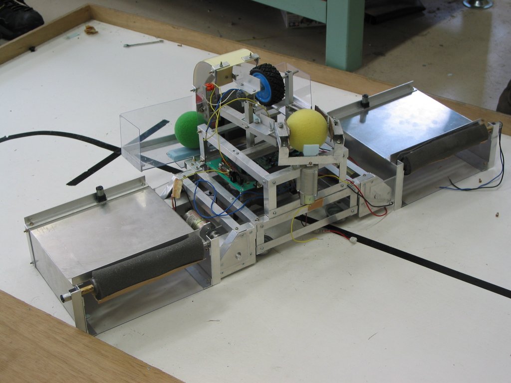 大きな箱を左右に展開してボールは回収します(フィールドを一回走ればボールは全て箱の中)。その後、ボールは一個ずつ取り出して色識別して各ゴールに打ち出します。