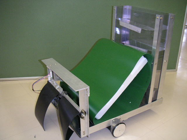 ライントレースですすみ、ローラーでかきとって、コンベアで格納庫にためて、排出する。