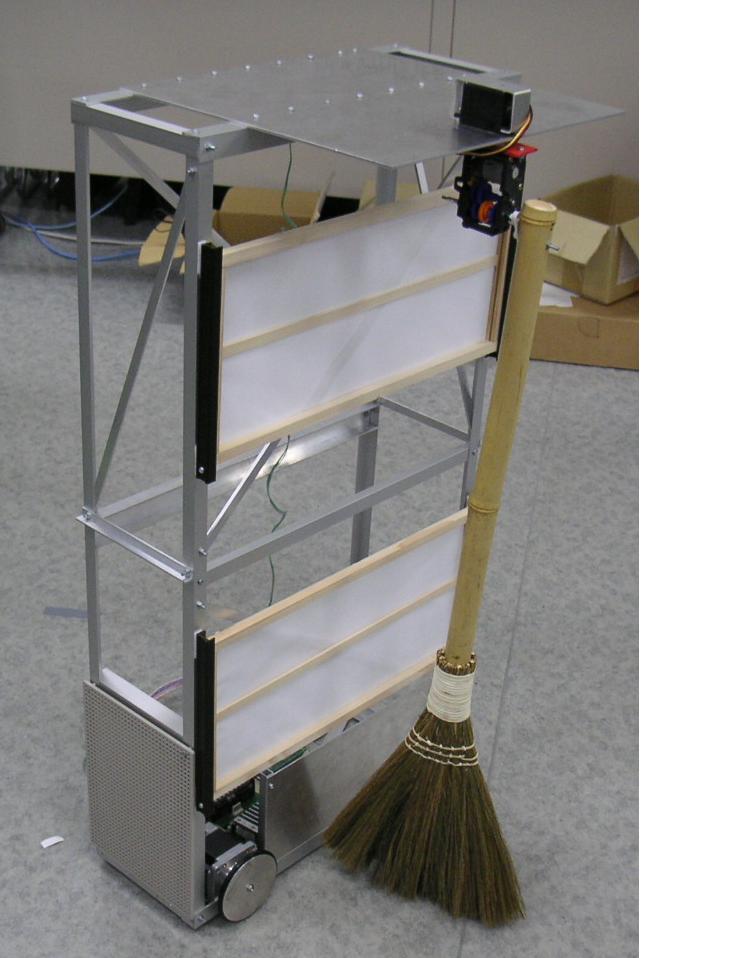 ボールを一気に掃きます。 Our robot sweeps a ball at a stretch. 箒を使います。 Our robot use a broom