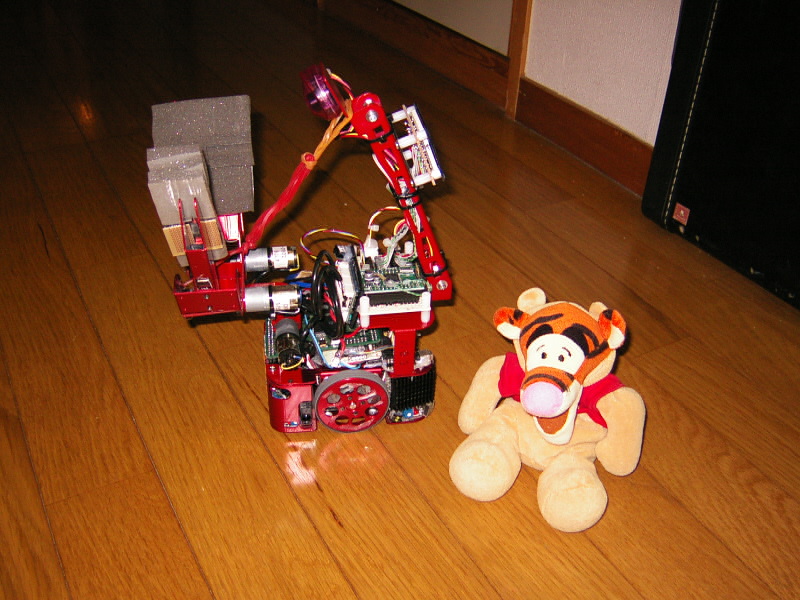 小型の機体に3個のCPU、5個のモータ、1台のカメラを、7個の赤外線センサ、 5個の測距センサを搭載しています。 アルミ板金の軽量機体なので、移動速度も高速です。