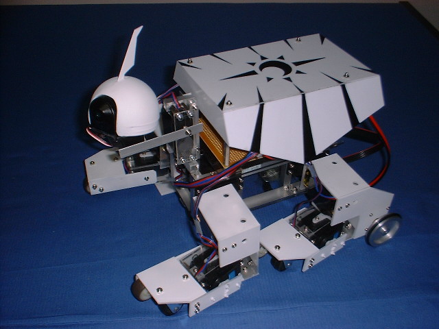 He can walk with 4 legs actuated by RC servo units. And he can also run with 2 wheels driven by DC motors. When he runs with wheels, he can use his forelegs as arms to catch balls.