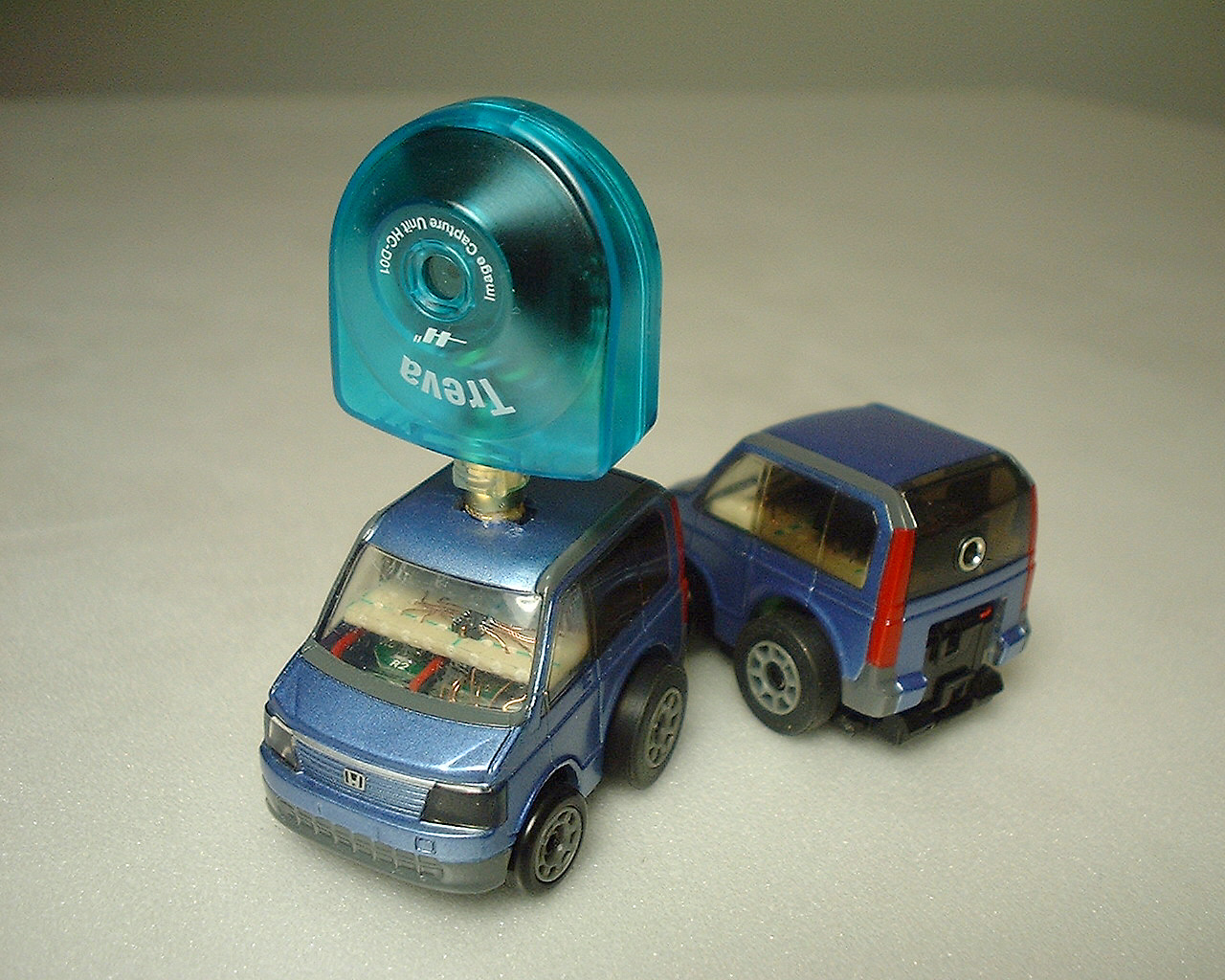 手のひらサイズのリモコン玩具と PHS 用カメラと超小型の 8bit マイコンを組み合わせて、カメラで撮った画像だけを頼りに動きます。 制御ソフトを工夫して、内蔵メモリの少ないマイコンでのボール認識やライントレースを実現しました。