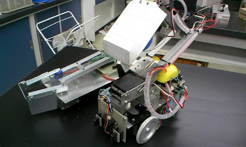 長いアームの付いたロボットはそのアームでボールを取りゴールに投げ入れます。もう片方のロボットは赤ゴールのところで壁となりボールを投げ入れやすくする等のサポートをします。