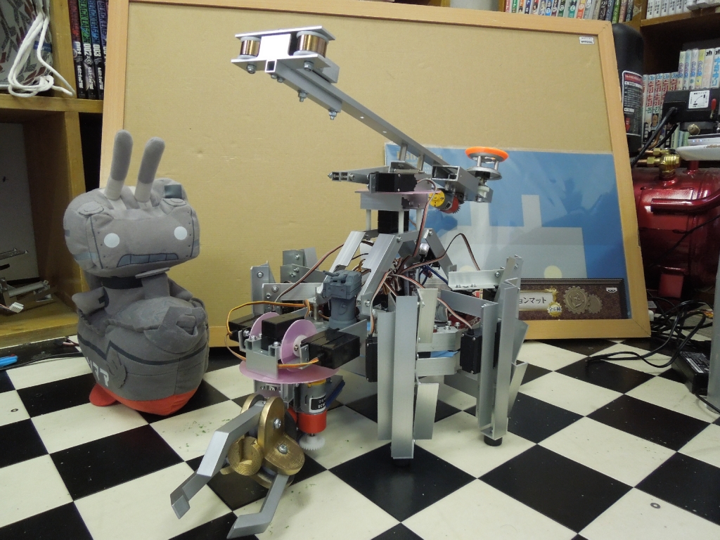 HAW-M00-IIから足を2本増やし,6本としたことで安定性が向上しました. Arduino及びArduinoシールドを用いることで制御を簡単に行えるようにしました.