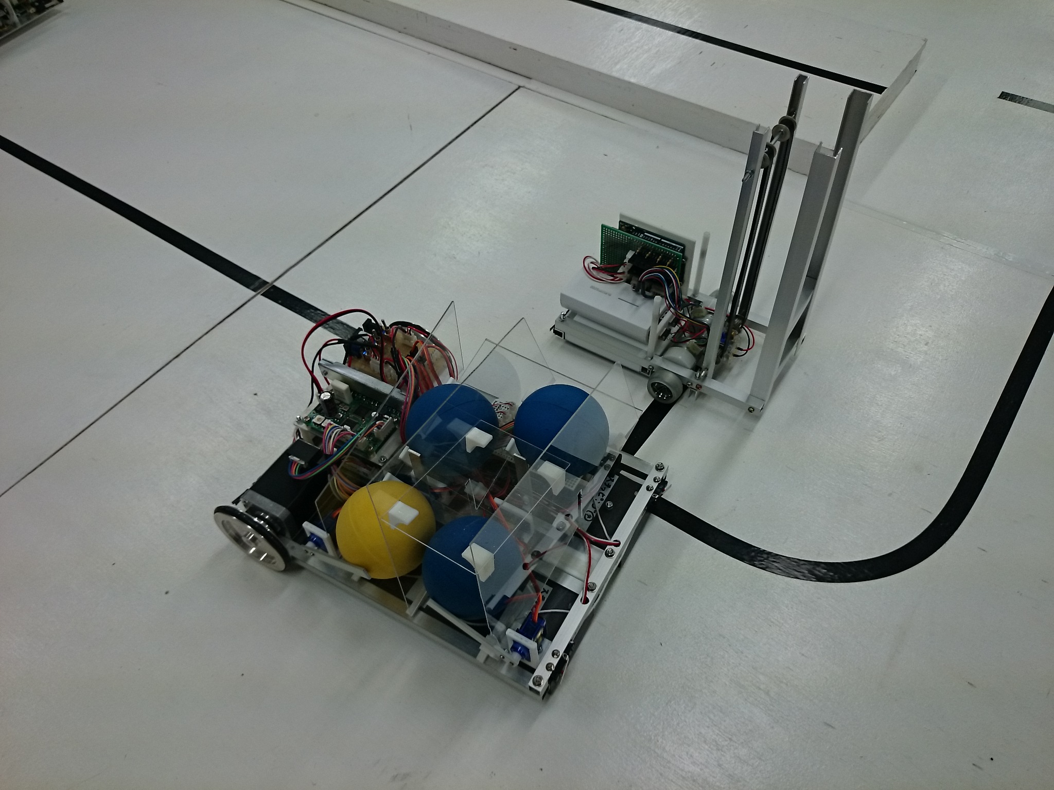 2台のロボットでボールを探し集め,1台のロボットがそれをゴールに入れに行く.
