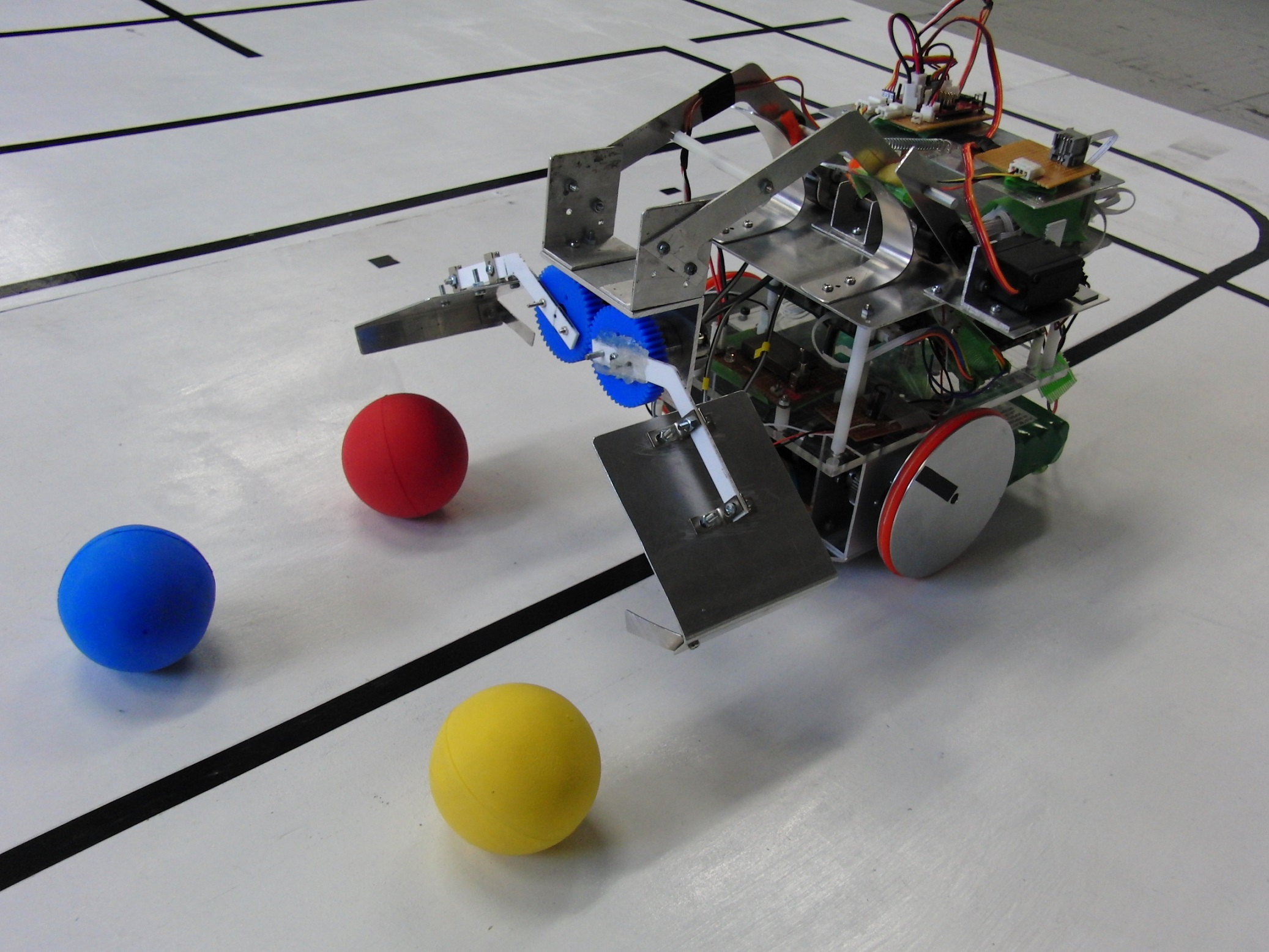 ボールを一個ずつ取って、一個ずつ箱に入れます。 移動はライントレースを行います。