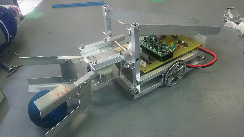 二つのサーボモーターを搭載したハンドでボールをつかんで持ち上げ、レールを用いることで遠くからゴールを狙います。