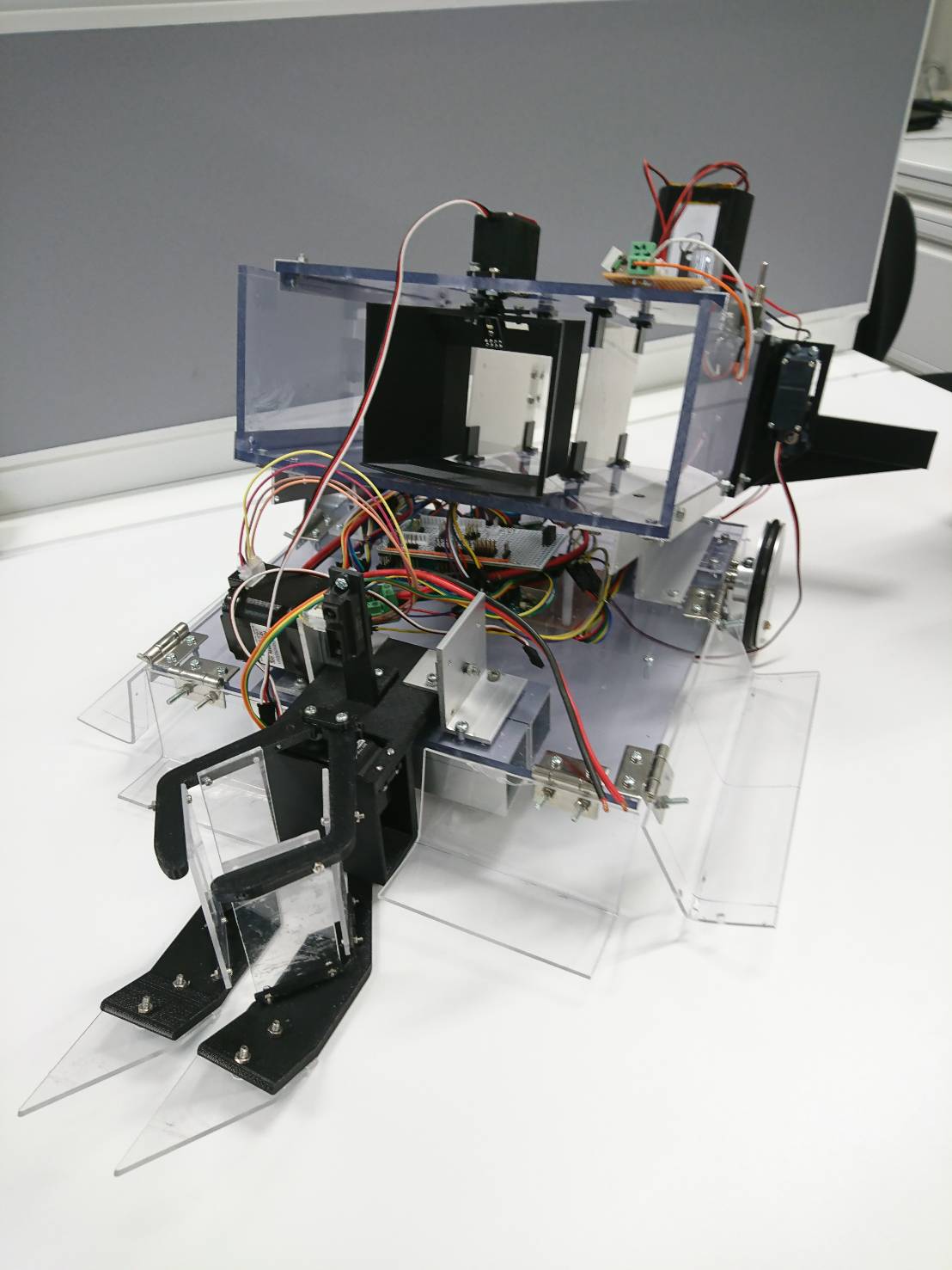 Characteristics: 距離センサで接近、アームで仕分け台に持ち上げ、缶・ボールを仕分ける。ボトルはアームで挟み、直接、台に乗せる。